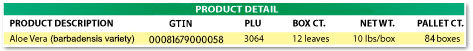Description: The leaves of the aloe plant (Barbadensis variety) are hand cut at the base of a mature plant. The aloe’s tough, fleshy, spear-like leaves are harvested between 18 and 24 inches long.